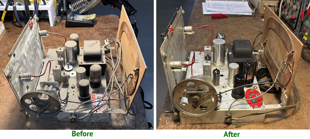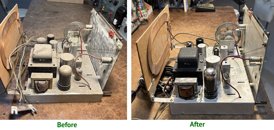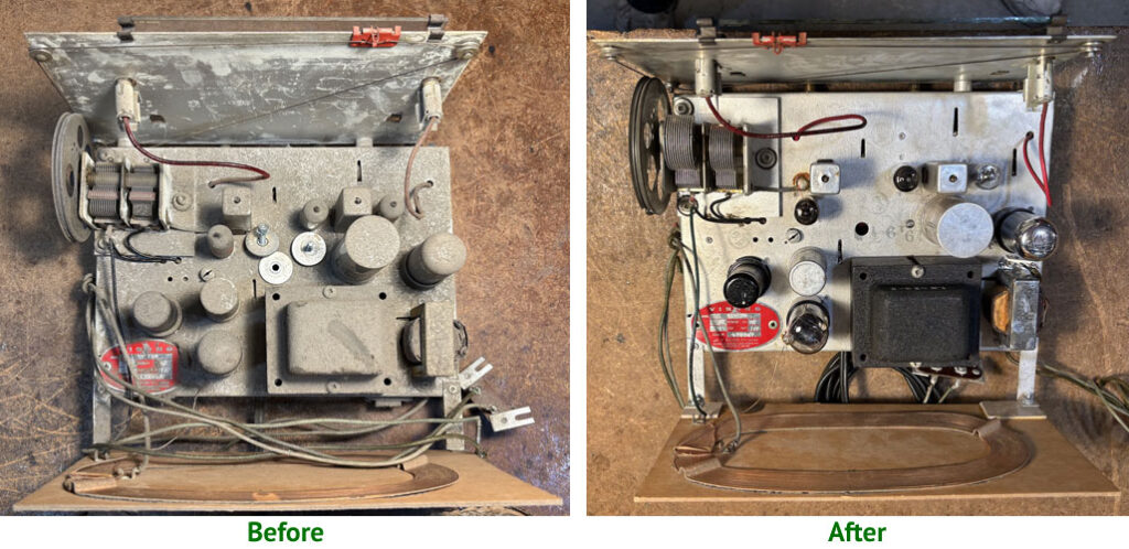 Chassis top extremely dusty; pilot lamps burned out, 4 out of 6 tubes were bad.